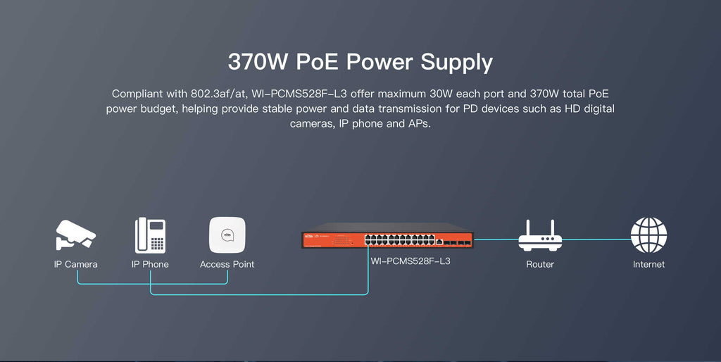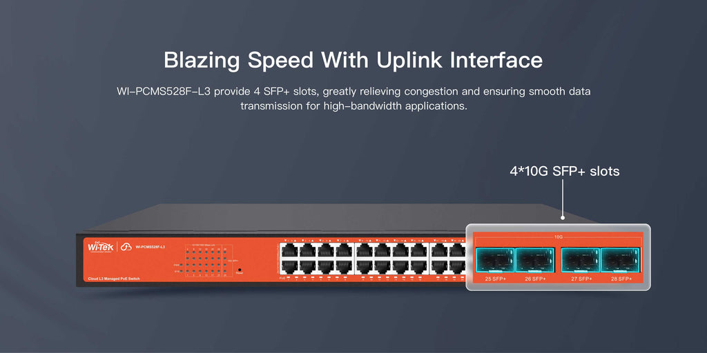 ● 24 Gigabit PoE+ ports and 4 10G SFP+ slots● 24 802.3af/at PoE ports with a total power supply of 370W● Support Static Route, RIP, OSPF and DHCP server.● Support diverse security strategies such as ACL, DHCP Snooping to protect your network● Support Wi-Tek Centralized Cloud Management Platform