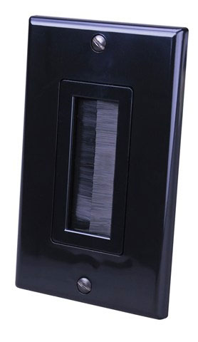 This plate is used to neatly have cables exit from a standard 1-gang size opening in a wall when pulling the cable directly to AV equipment. The brush plate design is used to allow cables to exit the wall in a aesthetic fashion.