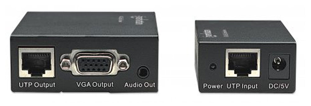Allows you to transmit VGA video and stereo audio (3.5mm jack) up to ~980ft using standard UTP network cable. The transmitter features a loop output for a redundant local display. The receiver has gain and peak line level controls on the unit to adjust the signal strength as needed based on the overall transmission cable length.