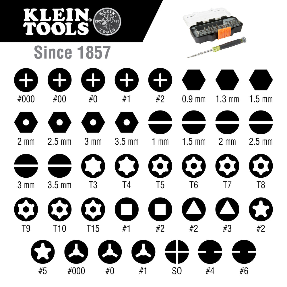 Klein Tools’ All-in-1 Precision Screwdriver Set with compact carrying case features 39 precision bits. This set provides everything you need to work with electronics and precision fasteners including those for Apple® products such as Apple® iPhone, MacBook, and Watch. The reversible barrel is standard on one side and extra-long on the other for those hard-to-reach jobs. Powerful magnets housed in the barrel better secure the bit, which also allows it to easily pick-up and retain fasteners. The Cushion-Grip handle and spin cap provide outstanding comfort and control.