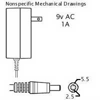 AC Adaptor: 9VAC 1A, 2.5x5.5mm