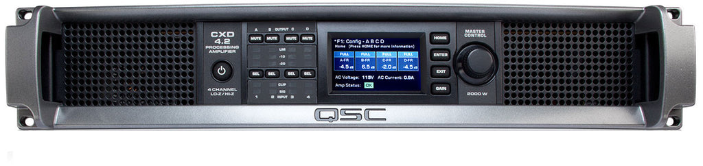 - Integrated front panel with channel select and mute buttons, input and output LED metering, 400x240 LCD, intuitive navigation buttons, LED power button and indicator, and cast aluminum handles.