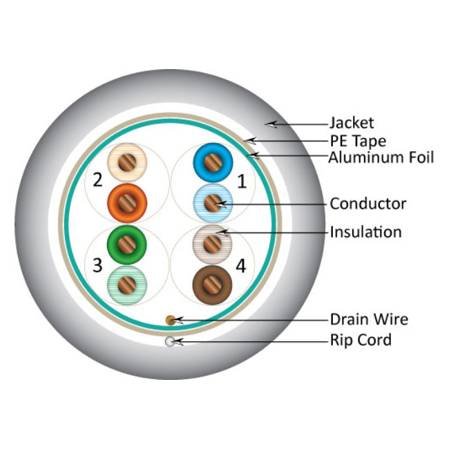 Category 5e (Cat5e / Category 5 enhanced) is a 350MHz rated cable that is designed to handle network speeds up to 1,000mbps (100m meters max). This cable uses 24AWG conductor made from bare, solid copper that are twisted into pairs that is then covered with an overall shield to prevent interference and reduce cross talk in environments that contain excessive EMI/RFI interference. The Plenum jacket is CMP rated, meaning that it is designed to prevent the spread of fire and gives off very little smoke and toxic fumes. This is required fire-rated corridors and many commerical, government, and military facilities. This cable is UTP (unshielded twisted pair) and uses standard Cat5e rated RJ45 plugs, 110 blocks, or patch panels for termination.
