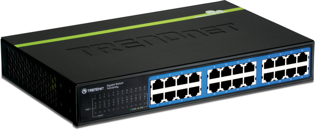 The 24-Port Gigabit GREENnet Switch, model TEG-S24Dg, provides Gigabit performance, proven reliability, and reduced power consumption by up to 70%. Embedded energy saving GREENnet technology works right out of the box with no management requirement. This compact metal switch offers a total switching capacity of 48 Gbps.