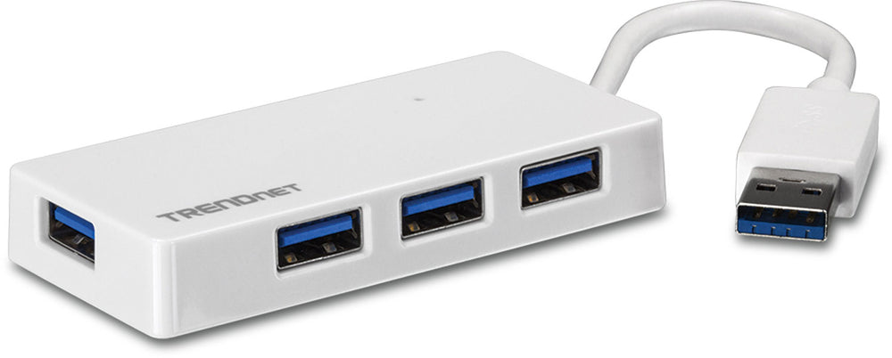 TRENDnet's 4-Port USB 3.0 Mini Hub, model TU3-H4E, instantly adds four 5 Gbps SuperSpeed USB 3.0 ports to a computer. No CD installation required-simply plug in flash drives, storage enclosures, and other USB 3.0 devices at speeds ten times faster than a USB 2.0 connection. The TU3-H4E is also compatible with older USB 2.0 and 1.1 ports.