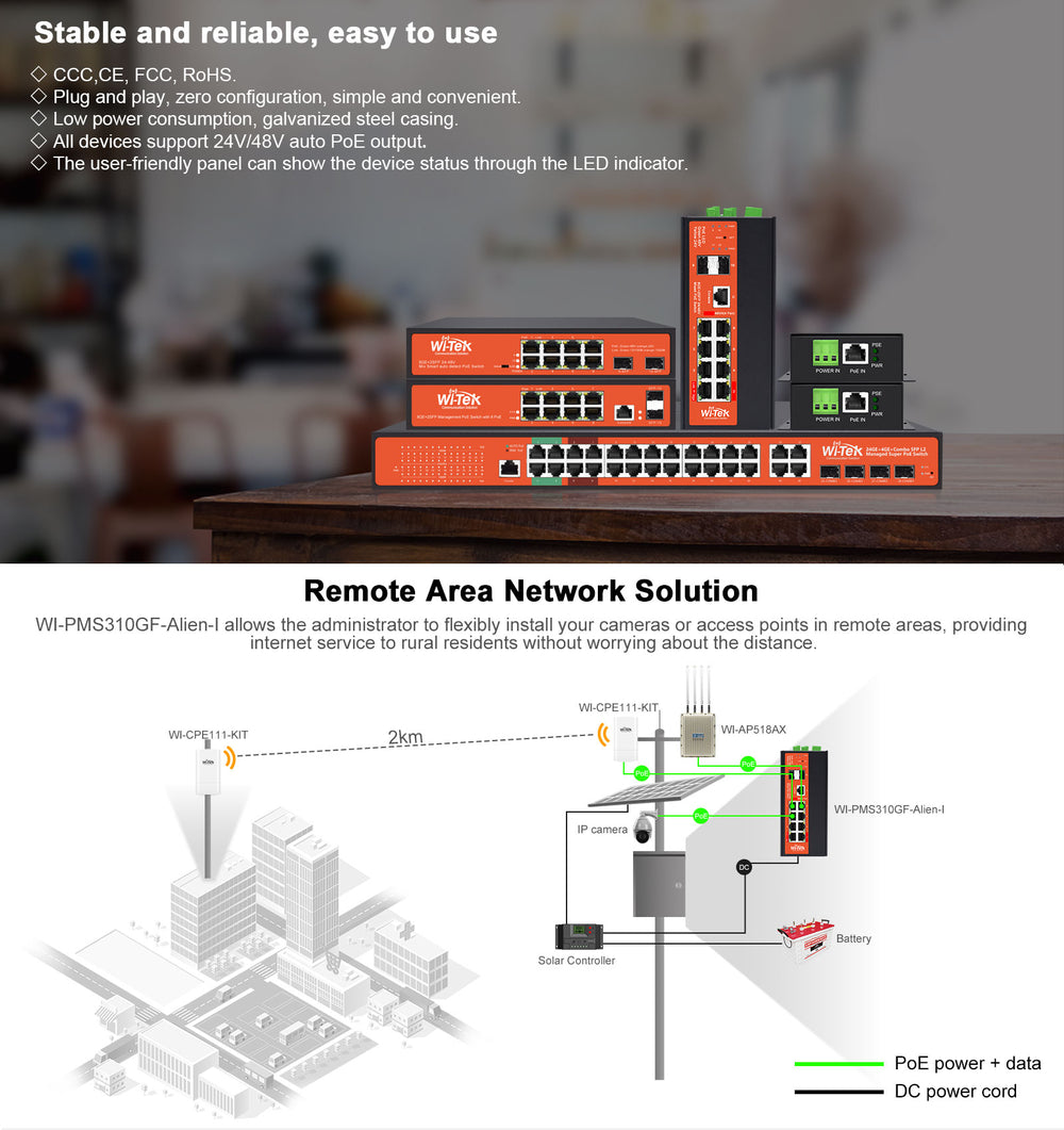 PoE Switch is suitable for 48V 802.3af/at and 24V PoE powered devices like many wireless AP, CPE, IP-cameras, VOIP phones, etc.